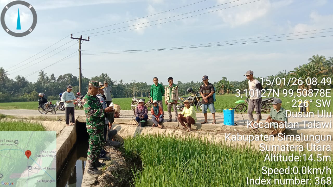 Kegiatan tersebut dilaksanakan di lahan persawahan Huta I Tiga Jadi, Nagori Tinjowan, Kecamatan Ujung Padang, Kabupaten Simalungun. Dengan penuh semangat kebersamaan, Babinsa bersama petani dan penyuluh pertanian turun langsung ke sawah untuk melakukan pengendalian hama yang berpotensi menurunkan hasil panen.