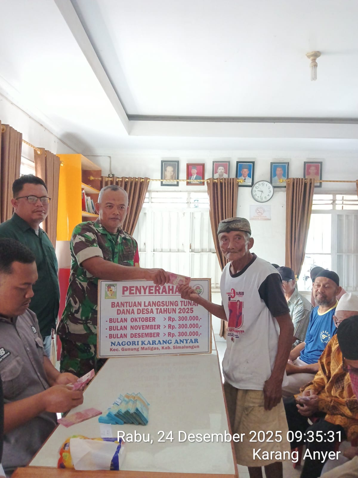24 MEDIA SUMUT Simalungun — Wujud kepedulian terhadap kesejahteraan masyarakat terus ditunjukkan oleh TNI melalui peran aktif Babinsa di wilayah binaan. Pada hari Rabu, 24 Desember 2025, Babinsa Koramil 08/Bangun Kodim 0207/Simalungun, Sertu Surya, melaksanakan pendampingan kegiatan pembagian Bantuan Langsung Tunai Dana Desa (BLT-DD) Tahun Anggaran 2025 untuk periode Oktober, November, dan Desember di Nagori Karang Anyar, Kecamatan Gunung Maligas, Kabupaten Simalungun.